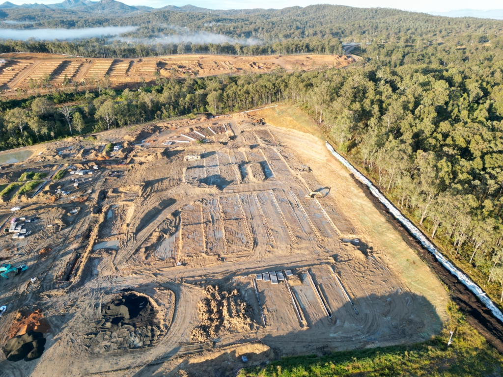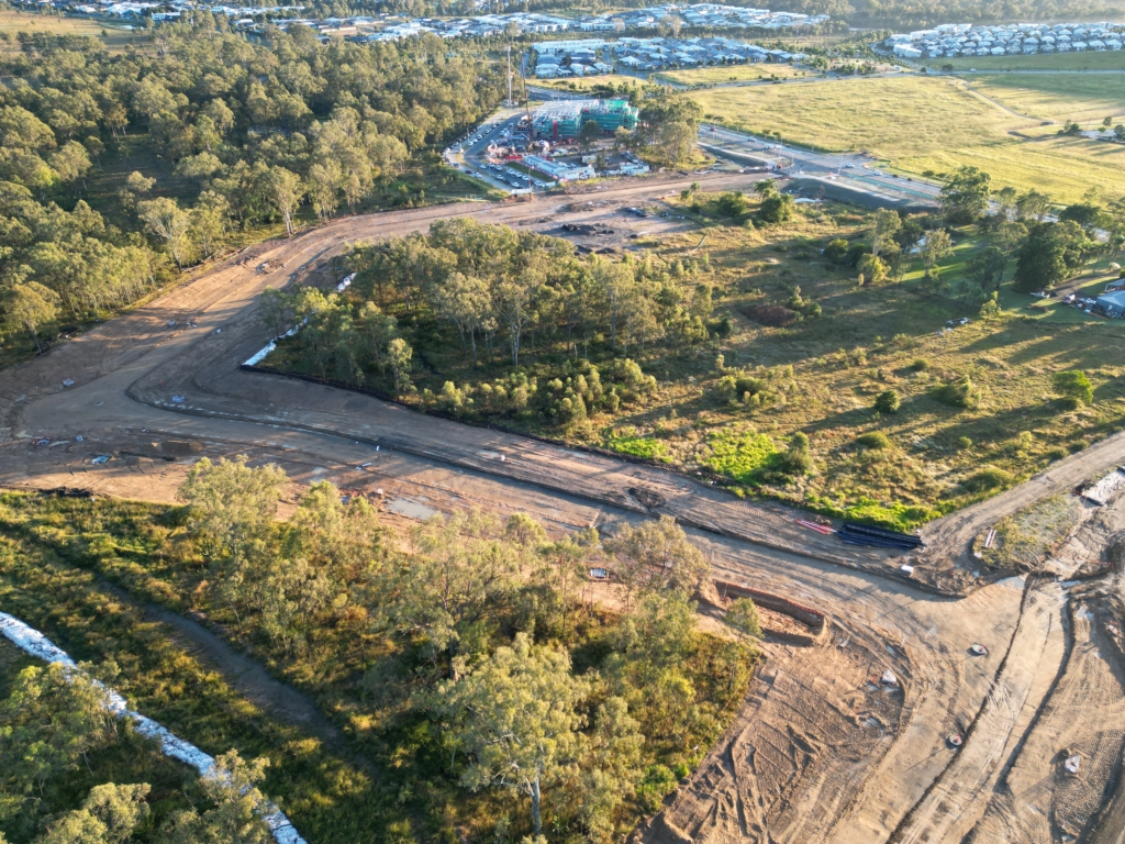 This month, the team has completed the installation of subsoil drainage pipes along Link Road and commenced watermain crossing works in the same area. Works also continue on the external sewer trunk line, with progress being made to support future servicing across the site.